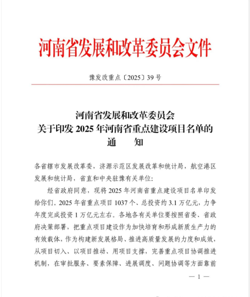 1月20日,河南省發(fā)改委發(fā)布《2025年河南省重點建設項目名單》。城發(fā)·高新生物經濟產業(yè)園名列其中,入選2025年河南省重點建設項目。2025年省重點項目1037個、總投資約3.1萬億元,力爭年度完成投資1萬億元左右。
